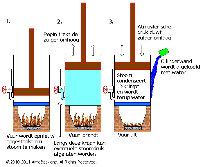 Fase 3: Papin dooft het vuur en koelt de cilinderwand af met koud water. De damp condenseert, krimpt en wordt terug water. Nu is er een onderdruk of vacuüm in de cilinder. De atmosferische druk duwt dan met flinke kracht (Atmosferische druk – (onder)druk in de cilinder) de zuiger omlaag.