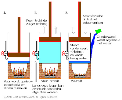 Maar de slimme Denis Papin (1647- ca.1712), een assistent van Huygens, gebruikte in ca. 1690 in plaats van het explosieve en gevaarlijke buskruit, stoom.